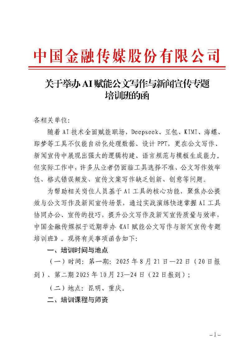 >举办AI赋能公文写作与新闻宣传专题培训班的函