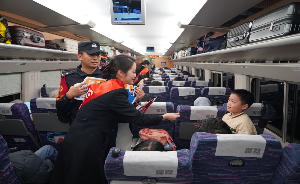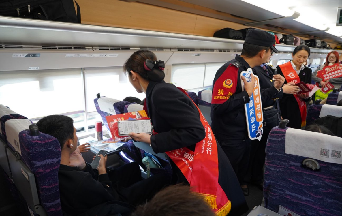 在“昆明—大理”的高铁车厢内,车厢里,乘警以真实案例开场的“乘警说反诈”搭配银行员工的有奖问答,让旅客们牢记“陌生二维码别乱扫”“亲友转账要核实”等防范要点,小朋友们更是在旅途中学习了金融知识。