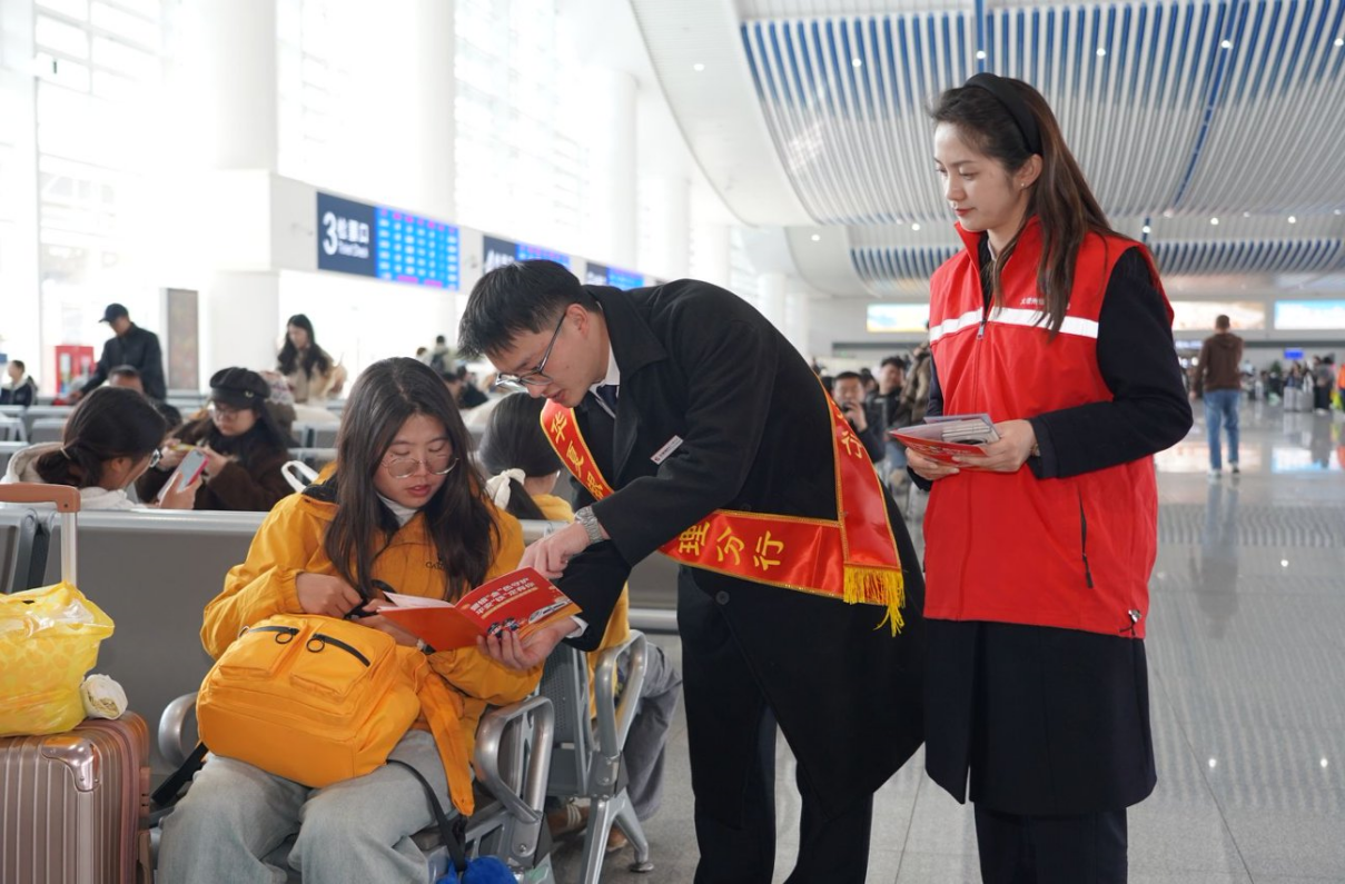 大理站的候车大厅与站前广场同样热闹,咨询台前排起长队,工作人员一边发放宣传折页,一边提醒旅客“春运期间要警惕‘抢票软件’诱导付费”;答题领春联的活动,金融知识谜语吸引不少旅客参与,“平时很少关注这些,今天听了讲解才知道,‘免费送礼品’可能是诈骗的开头。” 准备返乡的王阿姨说。