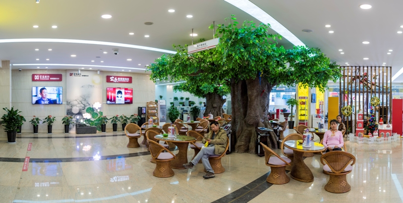 为使客户真正体验到国防支行的优质服务,支行进行了全面改造,着力将营业厅堂打造成以绿植元素为主题的绿色银行,倡导绿色金融、节能环保、无纸化办公环境。率先引进“激光一米线”、“激光迎宾语”,将现代科技切实运用到日常服务工作中。同时,用“花开富贵”盆栽装饰的咨询引导区,给客户耳目一新之感;两棵根深叶茂的发财树有效减少了客户在等候区的焦虑情绪;古朴典雅的竹藤转椅,不间断供应的各式饮品,打造出尊贵雅致的贵宾服务区,让贵宾客户有如临花园之感。国防厅堂围绕“绿色”的主旋律,为客户营造出温馨舒适的体验感。有客户赞誉:“那么漂亮,就像咖啡厅,居然会是一家银行!富滇银行就是不一样!”为使客户在等待之余感受贴心服务,支行特别推出了“悦心茶歇”温馨下午茶,免费为客户提供各式精致饮品及茶点。一经推出,客户好评如潮,更有客户反馈:“这简直是头等舱的待遇呀!”