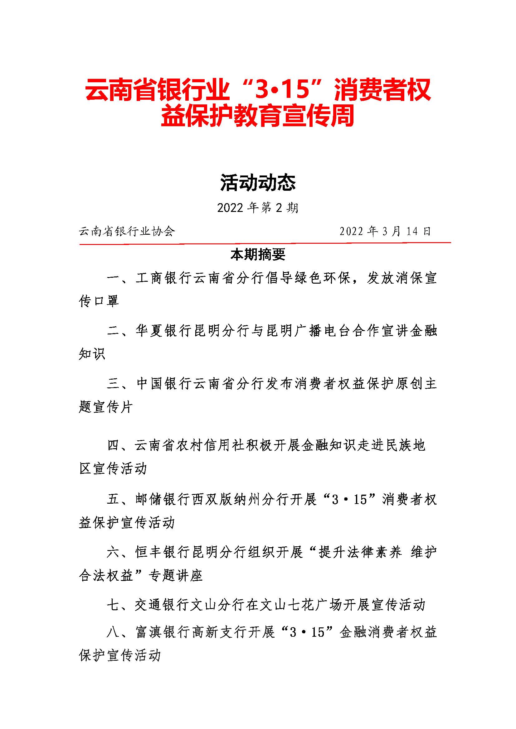 >云南银行业“3·15”消费者权益保护教育宣传周活动动态2022年第2期