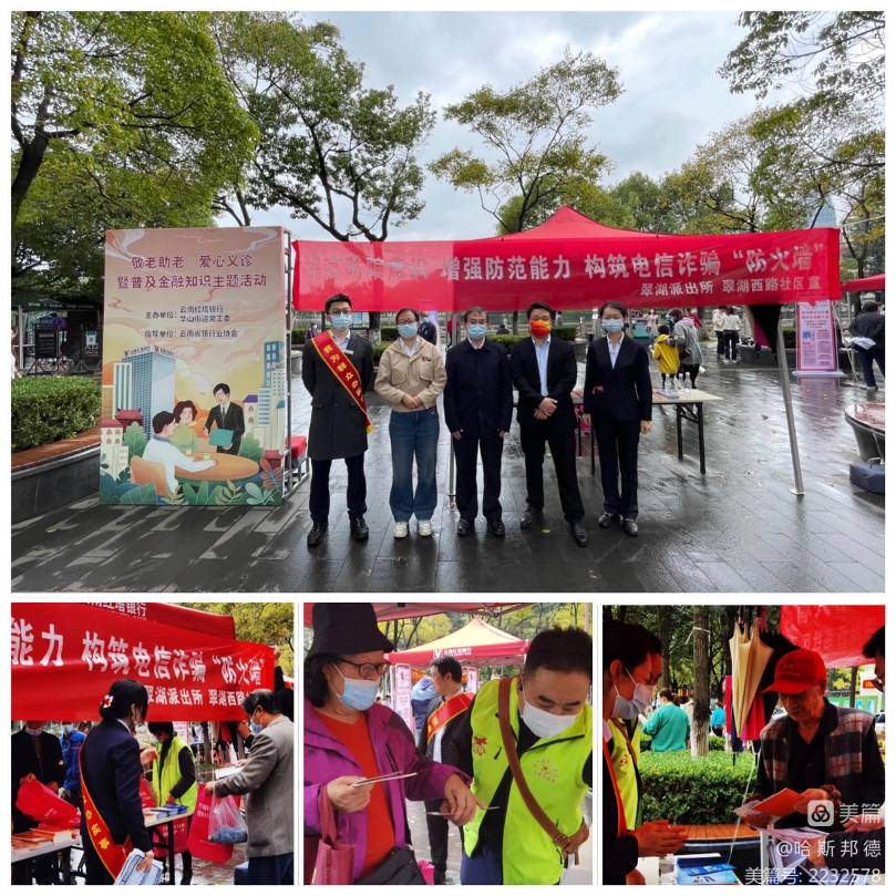 云南红塔银行深入贯彻党的二十大会议精神,积极落实监管部门“反诈防骗、敬老助老”的工作要求,在云南省银行业协会的指导下,联合滇医通、五华区华山街道党工委,于10月29日在翠湖老年人活动聚集区域开展“敬老助老·爱心义诊”暨普及金融知识普及主题活动,弘扬中华民族孝老爱亲传统美德,营造养老孝老敬老社会氛围。