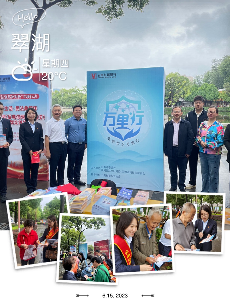 为深入贯彻党的二十大会议精神,进一步落实“主题教育”的工作要求。2023年6月15日,云南红塔银行与翠湖西路社区,在翠湖堤畔组织开展2023年“普及金融知识万里行”暨“普及金融知识 守住钱袋子”活动,云南省银行业协会到场指导。