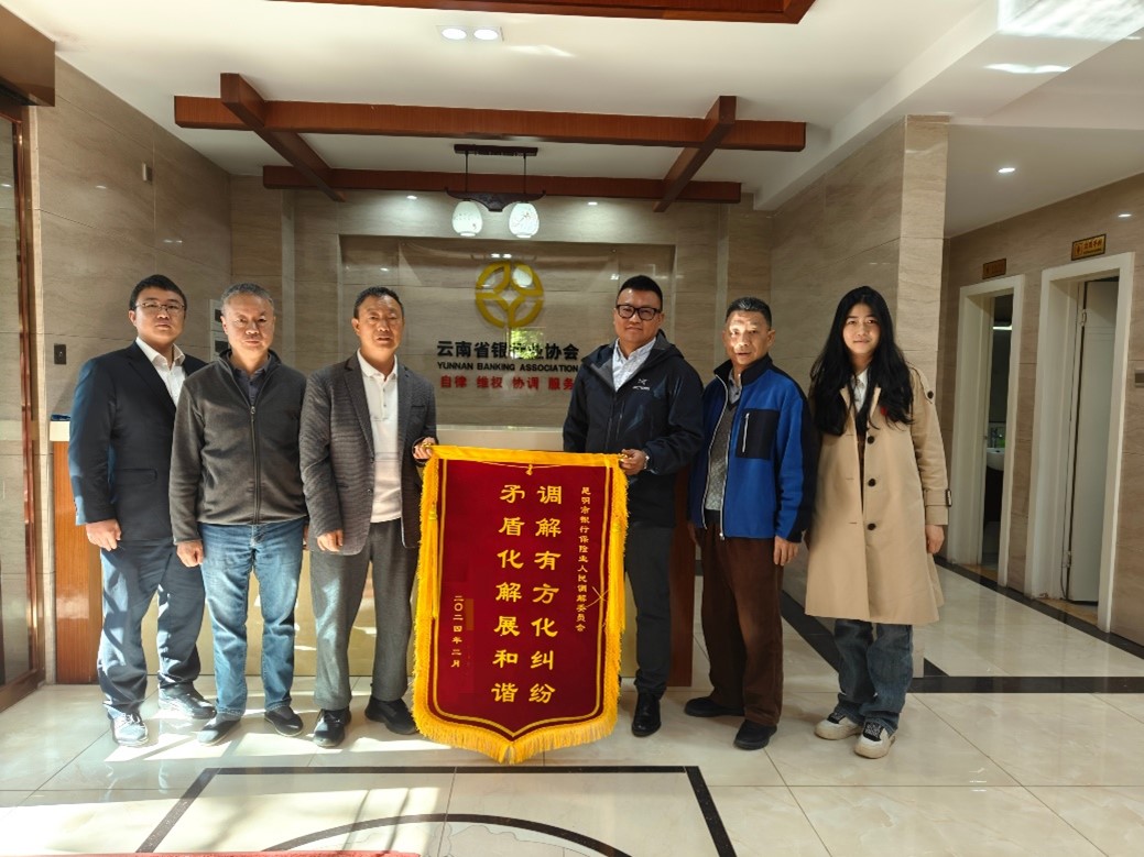 2024年3月5日,昆明某银行信用卡中心领导专程(以下简称“信用卡中心”)将一面“矛盾化解展和谐,调解有方化纠纷”的锦旗送到云南省银行业协会,对昆明市银行保险业人民调解委员会办公室(以下简称“调解办”)通过调解方式成功化解该行大量信用卡金融风险的支持帮助表示衷心感谢。