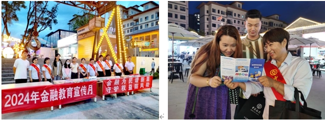 面向少数民族县域。9月5日,中国银行曲靖市分行配合监管在布依族乡之一罗平县长底乡,中国银行玉溪分行联合玉溪金融监管分局、中国人民银行玉溪市分行、玉溪市公安局、玉溪市财政局等在玉溪市红塔区东风广场面向哈尼族、彝族、傣族等多民族地区开展“金融为民谱新篇,守护权益防风险”金融教育宣传活动。多家金融机构在活动现场精心准备了形式多样的文艺节目,以“我为群众送台戏”的方式,通过情景剧、舞蹈、脱口秀等不同形式向当地村民朋友普及反诈和防范非法集资常识和理性投资知识,重点突出防范非法金融活动侵害,金融惠民利民措施和政策等,引导人民群众依法理性开展金融投资和维护自身合法权益等,精彩纷呈的演出引了众多村民朋友驻足观看。同一时间,在师宗壮族县域金融保险机构2024年9月“金融教育宣传月”活动启动仪式上,曲靖市分行工作人员通过题为《警惕征信类诈骗,守护金融安全》的金融知识主题演讲向到场群众进行了征信知识普及,活动期间还对到场群众发放“个人信息保护知识普及”及“警惕非法“代理维权”,理性维护自身权益”、“珍视个人信用,维护征信权益”等金融知识主题宣传折页,为群众送上暖心叮嘱,得到了在场群众的肯定与认可。 同时为持续做好行业诚信建设,引导金融机构和从业人员树立诚信理念,曲靖市分行行长带头录制“一把手说消保”原创视频,规范营销行为,严格执行金融产品、销售渠道、目标客户“三适当”要求,从源头上保护好金融消费者和投资者合法权益。此外,中国银行文山州分行到广南县开展“为群众送知识”金融教育宣传月活动。广南县是少数民族人口大县,少数民族人口占比超过63%。工作人员深入离乡镇网点距离远、集中宣传难以覆盖的地区,通过发放折页、动员收听乡村大喇叭等形式,为少数民族群体,传递金融知识。