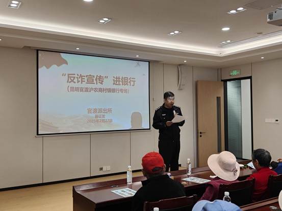 首先,官渡派出所聂征发副所长开展“反诈宣传”进银行(昆明官渡沪农商村镇银行专场),通过生动的案例讲解和情景模拟,向在场的中老年人充分讲解电信网络诈骗的常见手段、特点以及不断变换的新骗局,详细介绍了如何识别诈骗电话、“钓鱼”短信和邮件,以及一旦遭遇电信诈骗应如何迅速应对等,派出所聂征发副所长还给在场的受众充分讲授如何才能做到“不听、不信、不转账”的防骗措施。