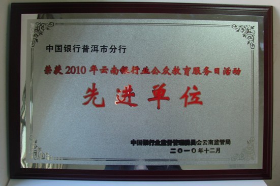 在中国银监会统一组织开展的“2010年银行业公众教育服务日”活动中,中国银行普洱分行党委高度重视,精心制定活动方案,以周密的组织、有力的措施、丰富多彩的活动、良好的精神风貌使本行的宣教活动展现出了亮点并收到了良好的效果,被中国银行业监督管理委员会云南监管局评为“2010年云南银行业公众教育服务日活动”先进单位,在云南省普洱市银监分局近期召开的通报会上受到了表彰嘉奖。