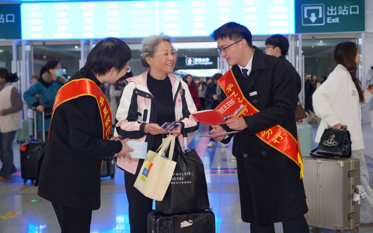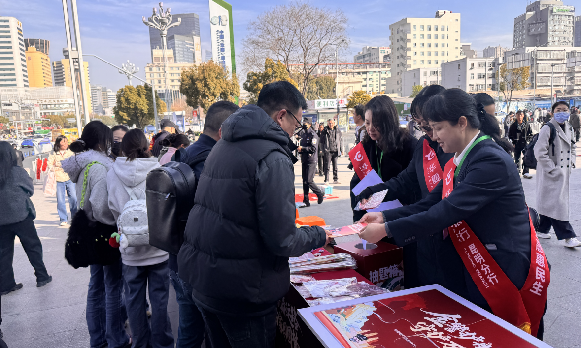 在昆明站站前广场,宣传台刚一搭起便围满旅客,书法家现场挥毫写春联,旅客通过参与金融知识答题、金融知识翻转牌、拼图等即可免费领取;候车大厅里,银行工作人员与乘警组成的 “宣传小队”手持折页,为候车旅客讲解“冒充电商退款”“低价购票陷阱”等典型案例,咨询台还同步提供银行卡安全、征信保护等问题的一对一解答。