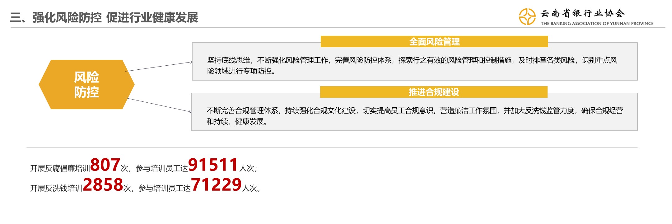 云南银行业围绕党的十九大关于坚决打好防范化解重大风险攻坚战的部署要求,深入落实《中国银监会关于银行业风险防控工作的指导意见》,按照“把防控金融风险放到更加重要的位置”总体要求,通过严格落实信贷政策及信贷资产的分类标准和操作流程,建立健全信用风险预警体系,维护资产质量稳定,保障金融体系健康发展。同时,全面推进合规运营建设和反洗钱工作,营造廉洁工作氛围,共同促进行业的健康发展。