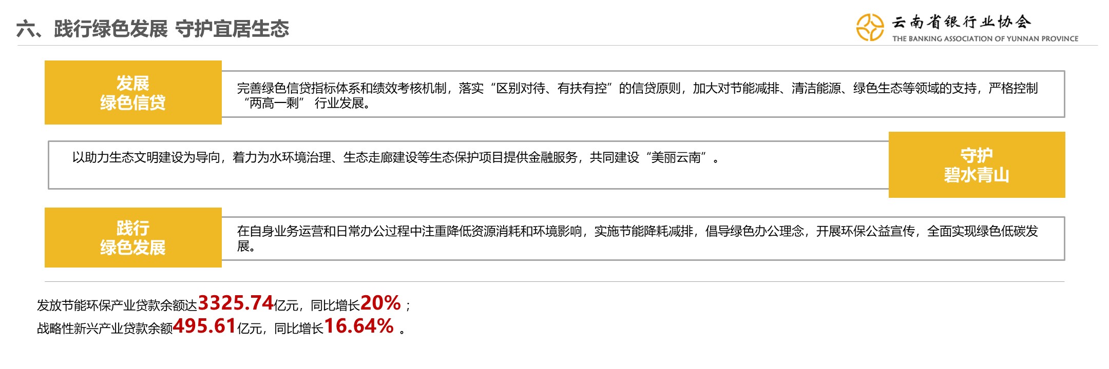 云南省银行业积极贯彻绿色发展理念,制定落实绿色信贷政策,加快完善绿色信贷指标体系和绩效考核机制,通过落实“区别对待、有扶有控”的信贷原则,进一步加大对绿色环保产业、清洁能源项目、生态环境治理项目的资金投入力度,支持企业节能减排,严格控制“两高一剩”行业发展,并持续推进绿色运营,开展环保公益活动,打造更加环境友好的“绿色银行”,为建设美丽中国贡献金融力量。